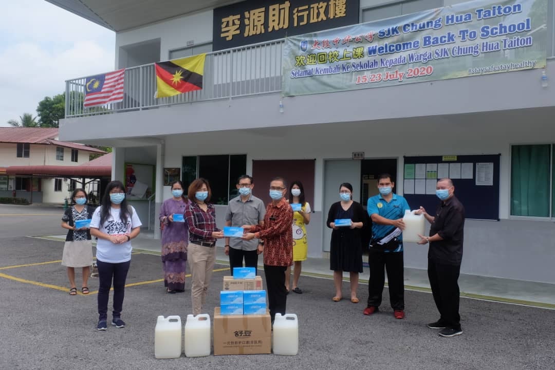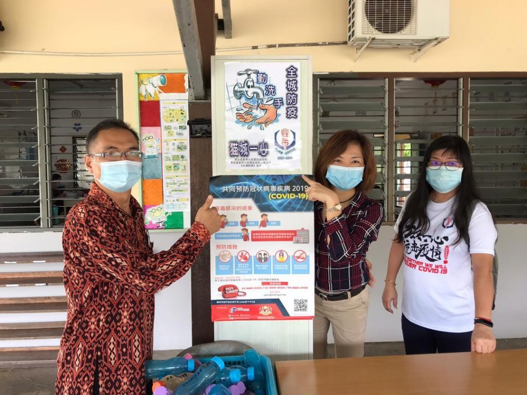 人联党峇都林当支部主席薛华东、晋汉连省华总妇女组主任张慧娇以及本固鲁贝朝兴率领团队到石隆门大段中华小学捐赠防护用品。