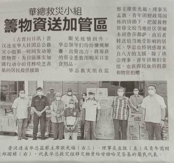 活动与文献, 活动剪辑, 特稿30-10-2020 “华总紧急救灾组” 筹募物资援助甘榜哈志巴基村民 Posted on October 31, 2020November 5, 2020 by 华总 31 Oct “华总紧急救灾小组” 筹募物资为目前处于强行管制令(EMCO)的甘榜哈志峇基村民送上粮食及生活用品,好让村民们顺利度过这个难关。由母会监察主席张光福,会务组副主任吴孟敦,以及青年团财政郑国栋代表移交其地方代表。 华总 22-10-2020 善心人士响应华妇号召捐赠72盒口罩予石角味源港中公 31-10-2020 砂华总第十八届(2019-2022)第一次会员代表大会以远端视频会议顺利召开,并共通过6项提案。